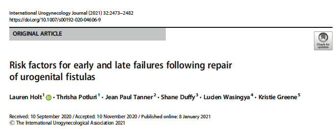 Métodos: Se realizó un estudio de cohorte retrospectivo para evaluar los factores de riesgo de recurrencia de la fístula. Criterios de inclusión: mujeres que se sometieron a la reparación de una fístula urogenital en un Hospital de Fístulas en Uganda entre 2013 y 2019. Nuestro objetivo principal fue determinar la incidencia de fallas tempranas y tardías e identificar y comparar los factores de riesgo para cada una. Se utilizó la regresión logística para calcular los odds ratios (OR) y los intervalos de confianza (IC) del 95% que representa la asociación entre cada factor de riesgo para fallas tempranas y tardías.